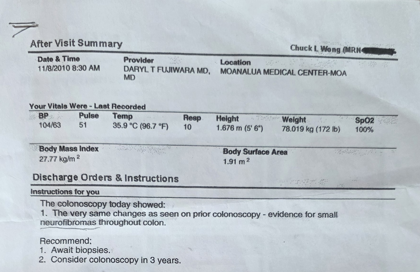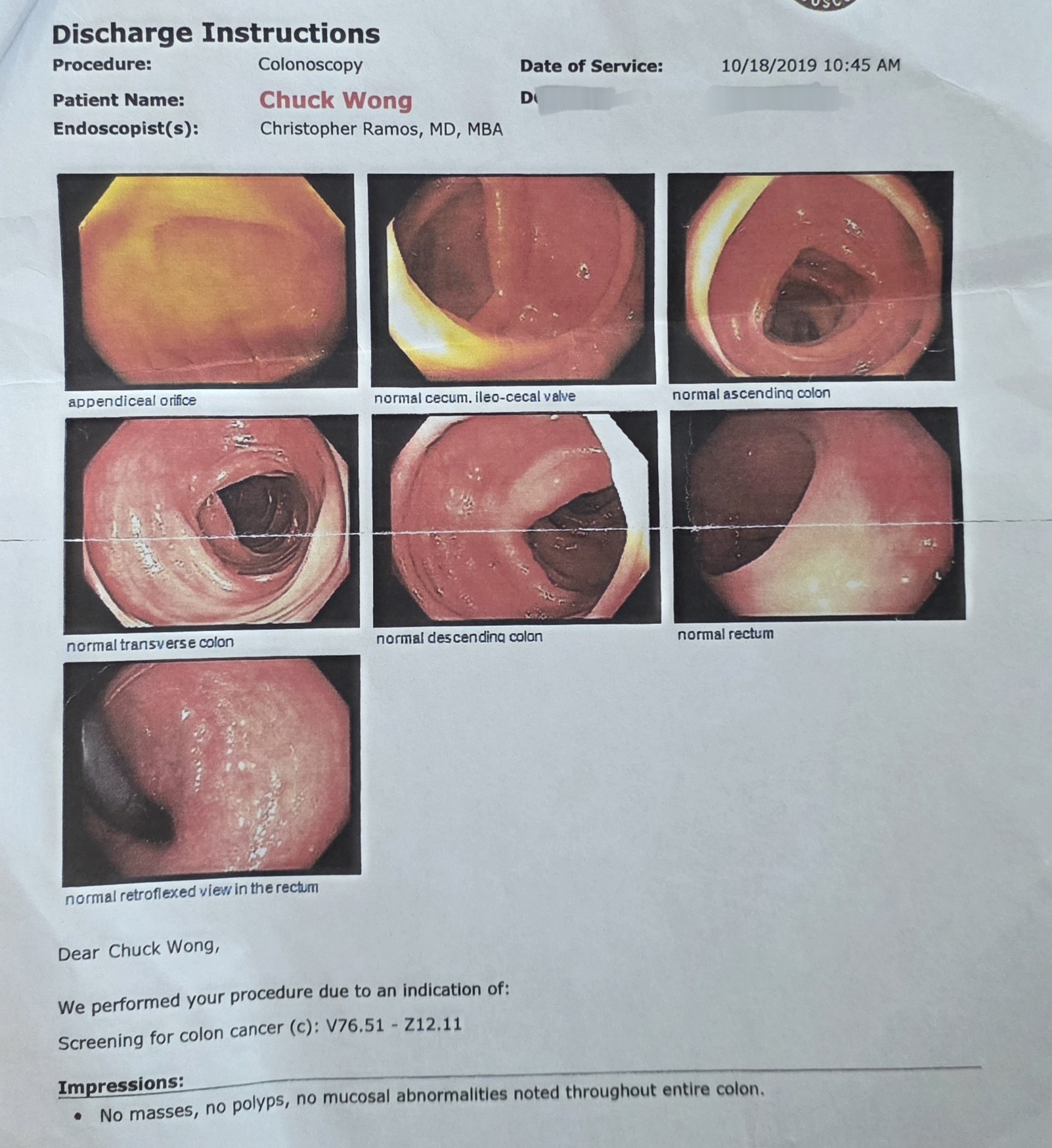Note: If you would like to see the medical documentation, click below to see his official diagnosis from 2010, and later colonoscopy imaging and diagnosis which confirms the absence of any tumors. These records have been included with Chuck’s permission.